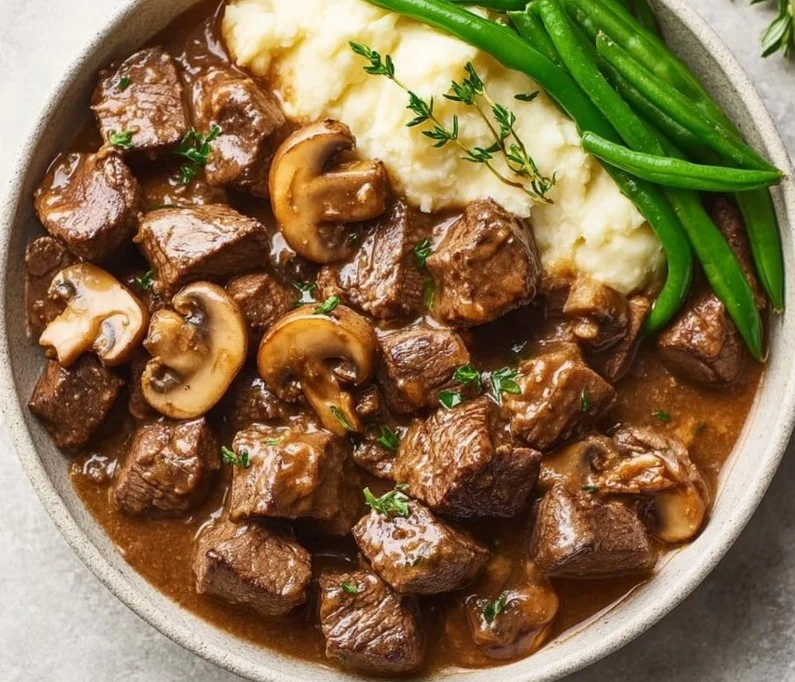 A comforting dish featuring tender beef tips in a rich mushroom gravy, perfect for family dinners and special occasions.