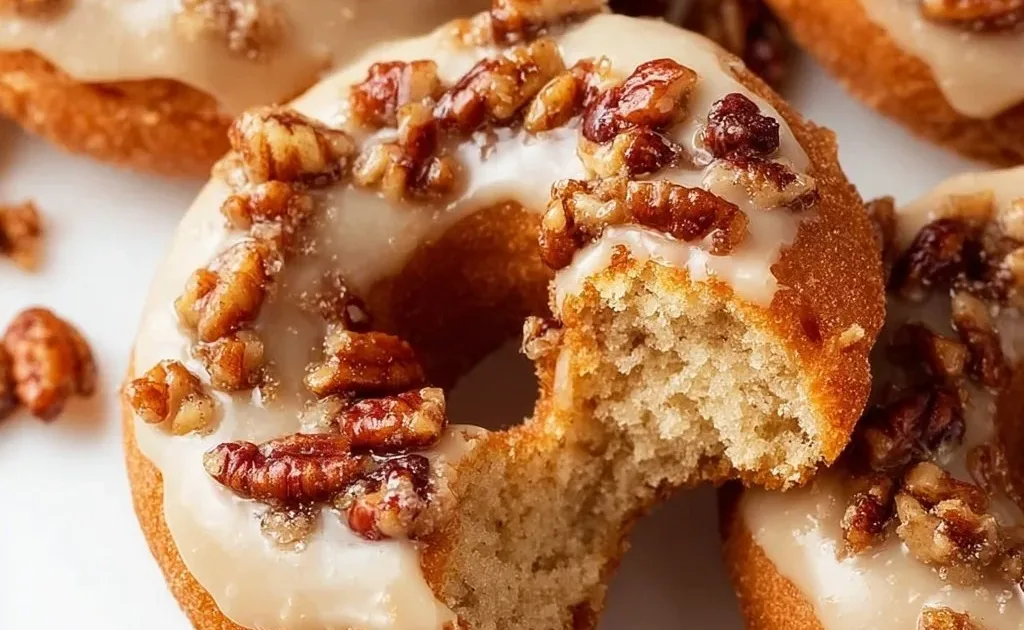 These donuts are made by mixing simple ingredients, incorporating nutty brown butter, and then baking to golden perfection. Drizzle them with creamy maple glaze and top with crunchy pecans for a final touch.
