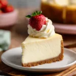 This classic cheesecake is rich, creamy, and smooth with a buttery graham cracker crust, perfect for any special occasion.