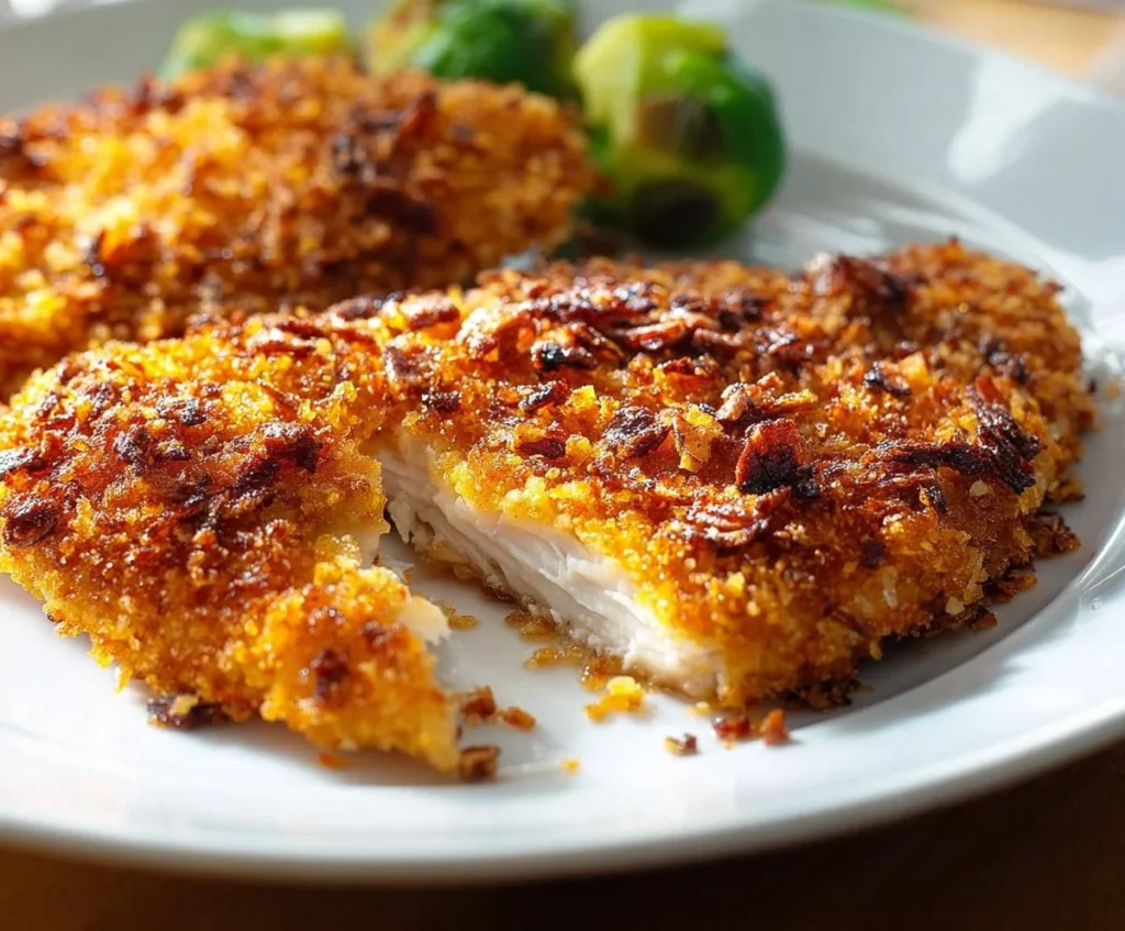 Pecan-Coconut Crusted Tilapia served on a plate with lemon and herbs